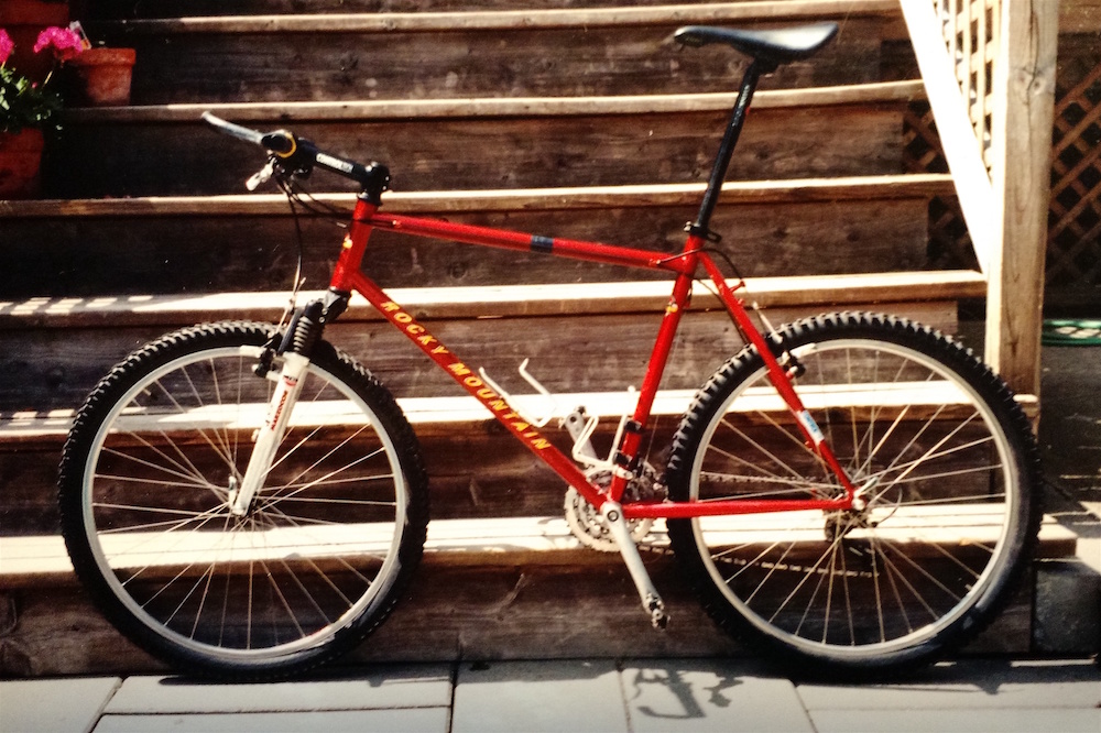My first mountain bike (that is, not the Canadian Tire-sold monstrosity that preceded it or the oversized fully rigid 1994 Specialized Rockhopper that came second) was a 21" 1996 Rocky Mountain Hammer Race.