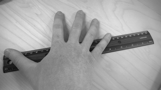 My hand span (as pictured below is something that you measure from the outside tip of your thumb to the outside tip of your little finger) is about 22 cm or 8.7 inches. Not especially huge, but big enough to make it difficult to find a mouse that adequately supports my hand and doesn't cause pain in my wrist and forearm, cramps on the back of my hand and numbness in my fingers.