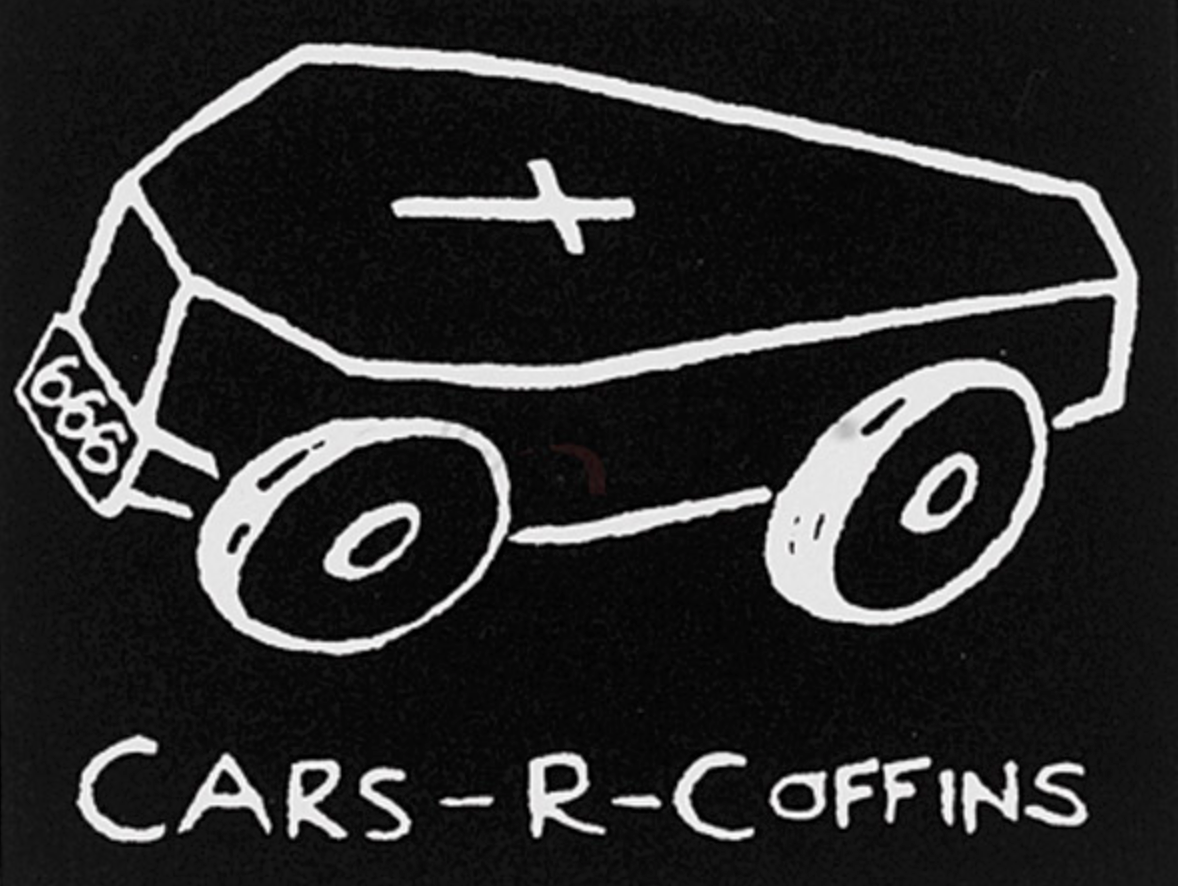 I used to think that the Cars-R-Coffins message referred to the person driving the car; they were destined to be in a coffin sooner rather than later due to lack of exercise. Nowadays, I feel like that reference to the coffin is for me and other cyclists.
