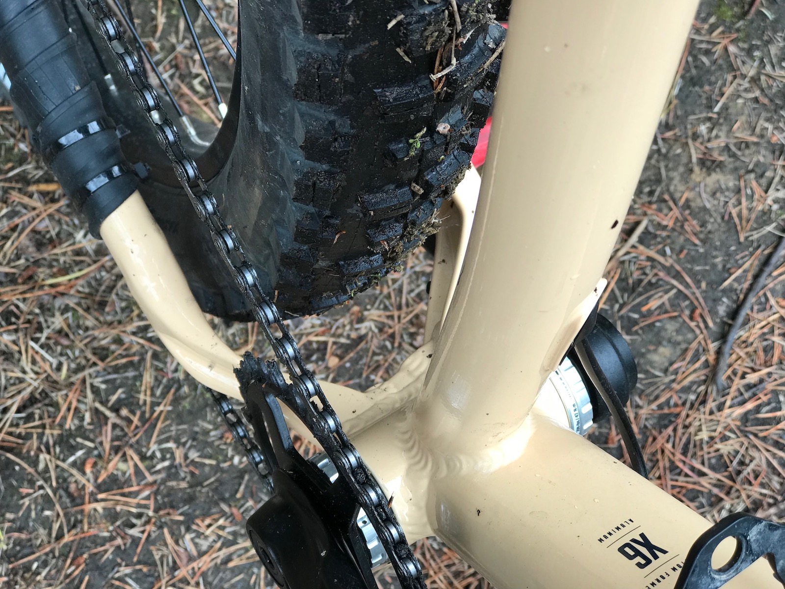 I'm also loving the plus wheels: Maxxis Minion DHF and DHR 27.5" x 2.8" tires matched with Alex MD-35 rims. I'm used to fiddling around with air pressure from riding fat bikes, so that's no big deal. I think I'm almost there with 19 lbs. of pressure in the front tire and 22 lbs. in the rear. I tried running them both lower, but I struck the rim a few times and returned to more air pressure.