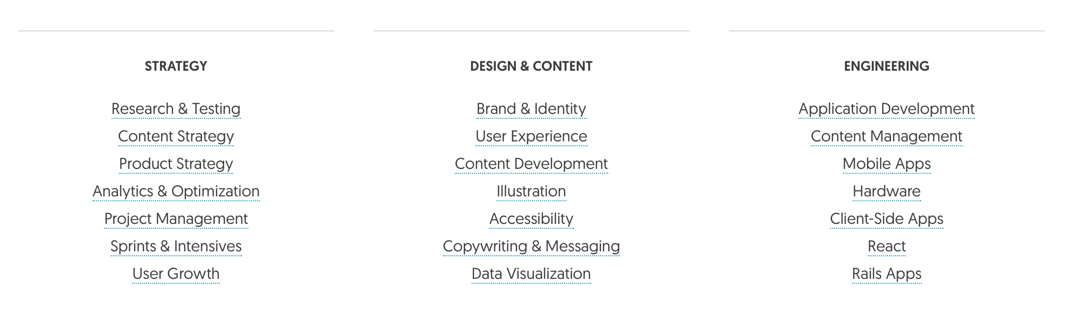 To paint a picture, let’s consider one of the larger American digital agencies and their scope of services. They have over 70 employees and this is their stated list of capabilities: