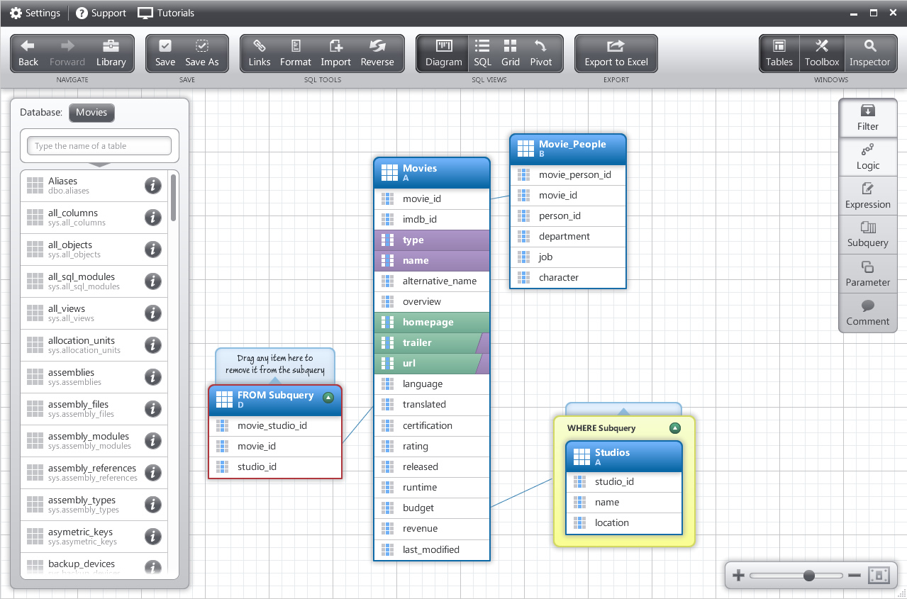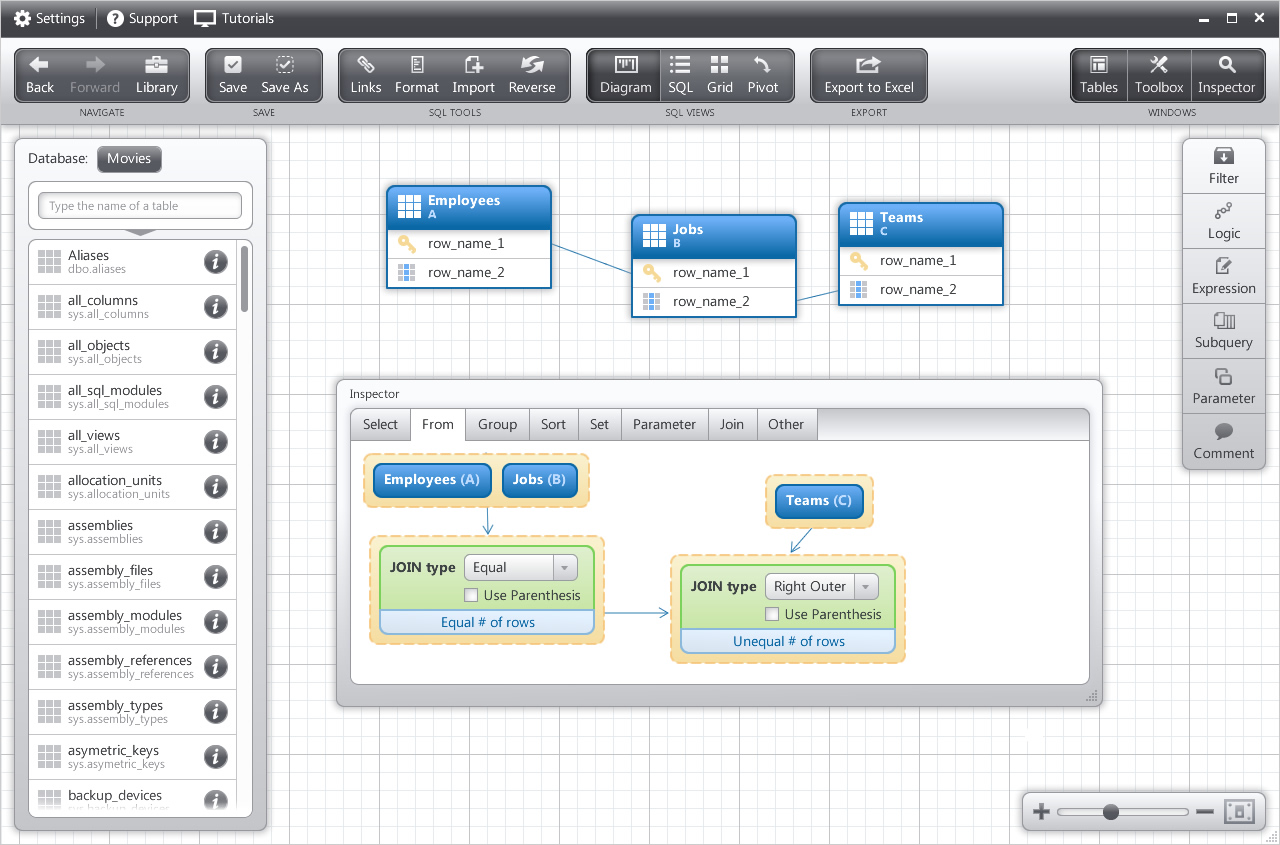 The purpose of visual SQL query builder software is to make complex database report creation simpler and more accessible. The software is meant for people who don’t want to nor have the knowledge to write complex SQL queries themselves, but still need custom reports that they can produce on their own.